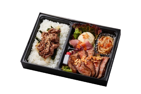 YAKINIKU弁当-赤身ステーキ-は特選和牛の炉端焼肉や鉄板焼ステーキなど、贅沢な味わいが詰まったお弁当です。万人に好評で、持ち運びも便利!この絶品弁当をぜひお試しください。白米の美味しさをそのままに、栄養価(白米の24倍の食物繊維と低糖質)の高い【国産100%押し麦入りご飯で】ご提供します。