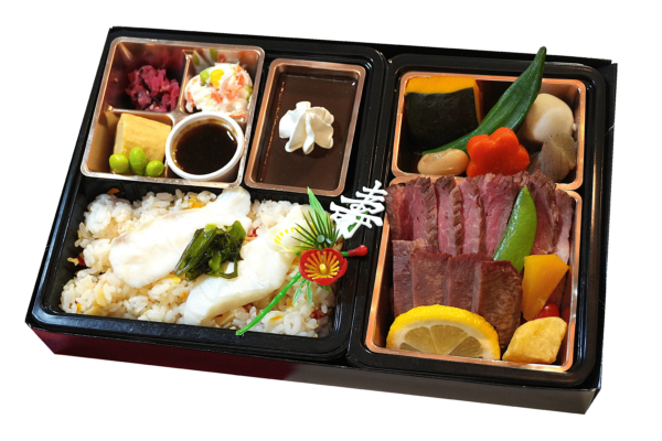 厳選したオーガニックビーフの肩ロースを使用したステーキは噛む度に旨味が溢れる一品です。ご飯の上の寿ピックは1月1日~1月末の期間のみ使用しております。