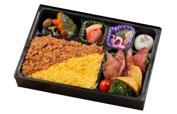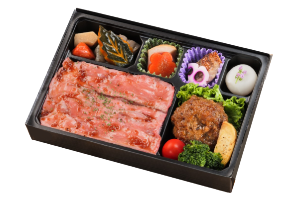 黒毛和牛のすき焼き重、冷めても柔らかい和牛ハンバーグ、肉のうまみが詰まったローストビーフがお楽しみ頂ける三段の御弁当です。