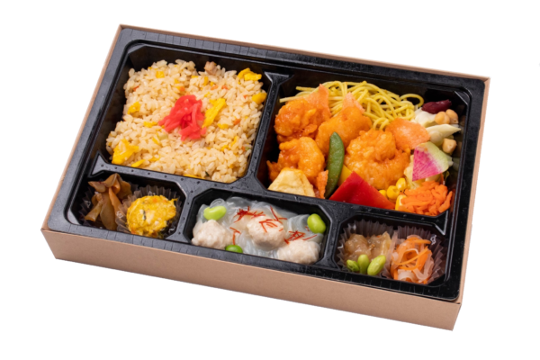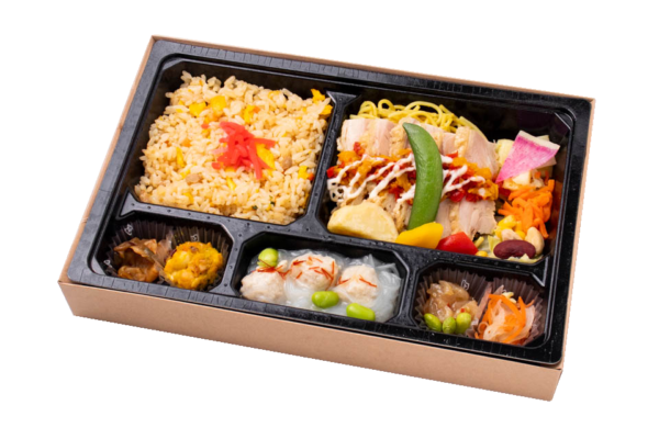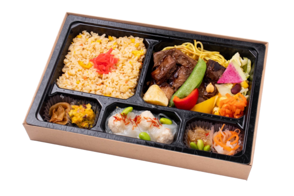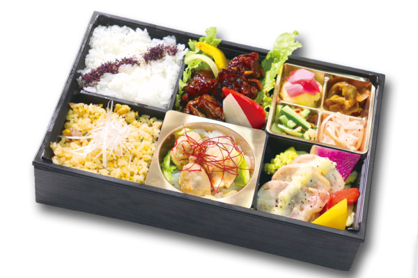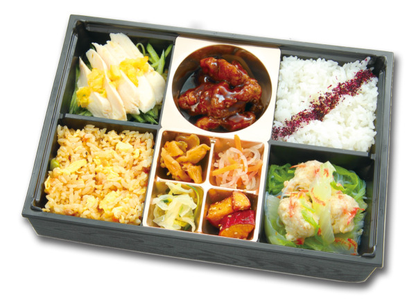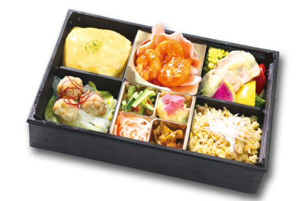 【内容】 黒毛和牛の香味黒酢ソース合え・煮込み豚団子・炒飯・季節のお惣菜 等