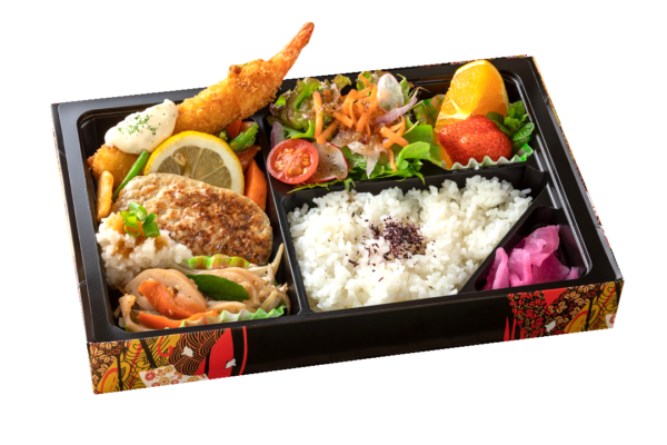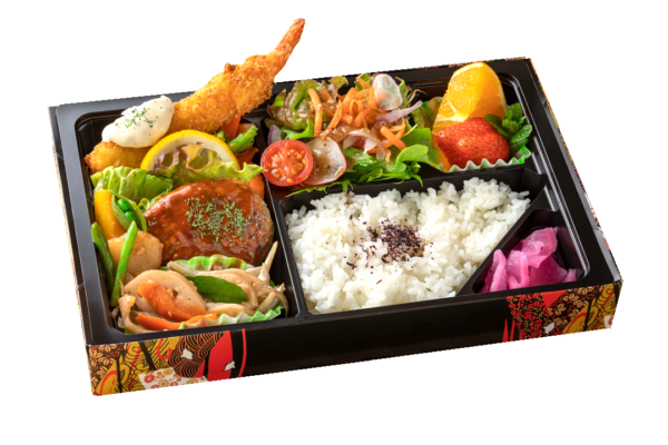 ふわふわのデミグラスハンバーグに白身魚フライ、エビフライ、唐揚げ、ヒレカツが1つのお弁当に集合しました。旬の食材を使った副菜も魅力!是非ご賞味ください。