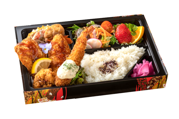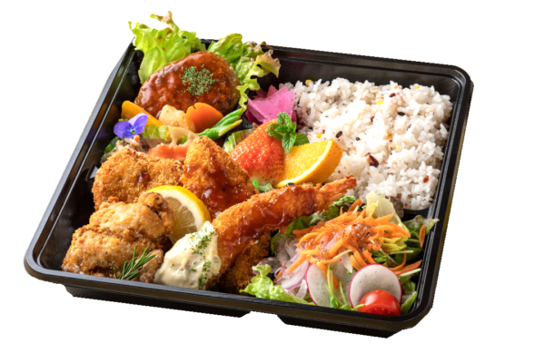 【内容】 白身魚フライ・エビフライ・唐揚げ・ヒレカツ・白米・季節の惣菜 等
