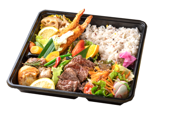 大きなエビフライ2本と柔らかい牛ステーキや帆立とチキンのバジルソースがけが入ったボリューム満点のオススメのお弁当です。
