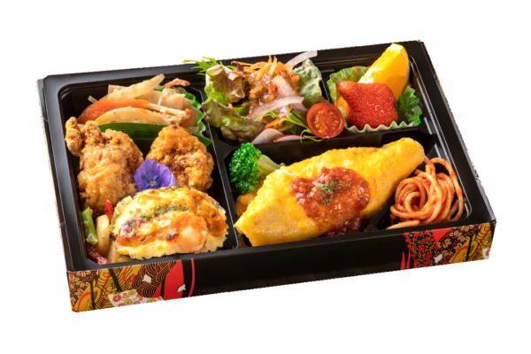 バターが香るふわふわとろとろの卵で包んだオムライスに、唐揚げとグラタンがセットになった欲張り弁当