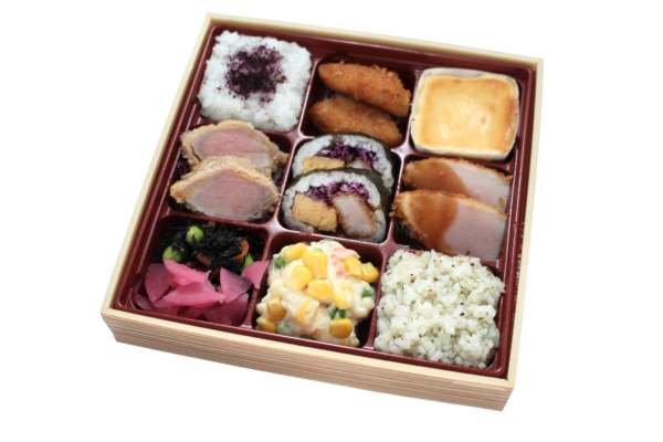 【内容】 ゆかりご飯・メンチカツ・チーズケーキ・ヒレカツ・キンパ・チキンカツ・ひじき漬物・ダイスサラダ・バセリバターリゾット 等