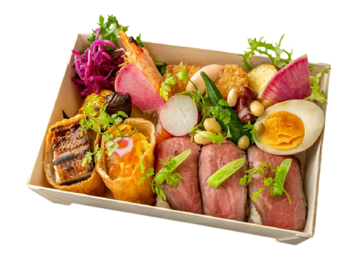 HI-FIVE特製肉寿司、韓国風いなり、鰻いなりを盛り込んだ豪華で贅沢なお弁当です。