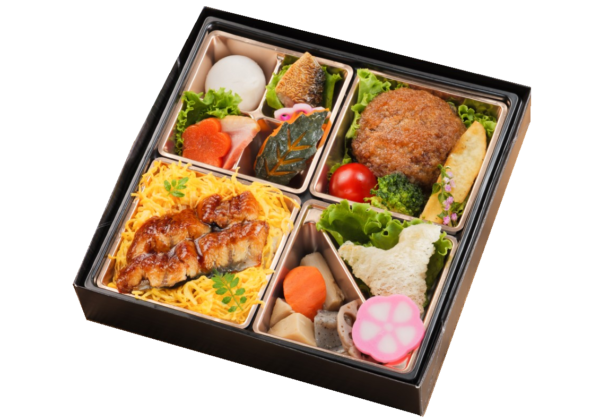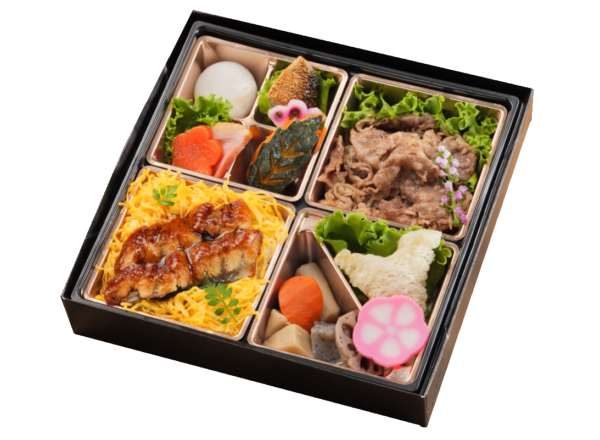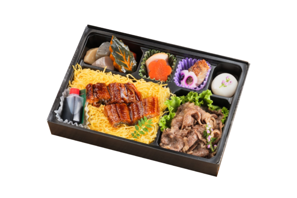 【内容】 うな重・黒毛牛のステーキ(和風ソース)・ローストビーフ・カモロース・焼き鯖・だし巻き卵・季節の炊き合わせ 等