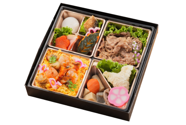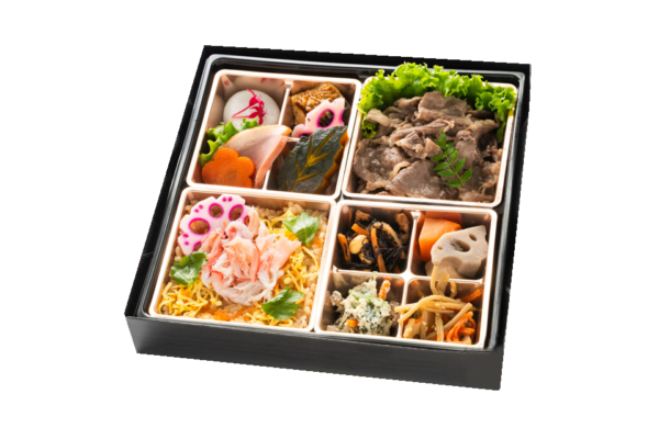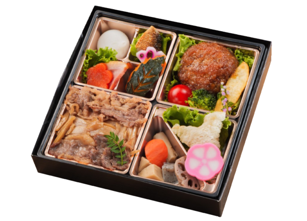 【内容】 黒毛和牛すき焼き重・和牛ハンバーグ(和風ソース)・ローストビーフ・カモロース・焼き鯖・だし巻き卵・季節の炊き合わせ 等
