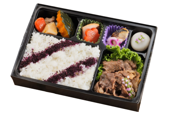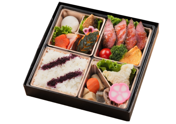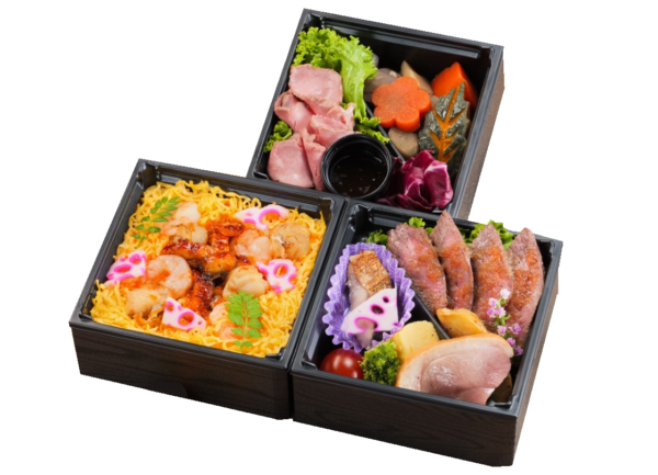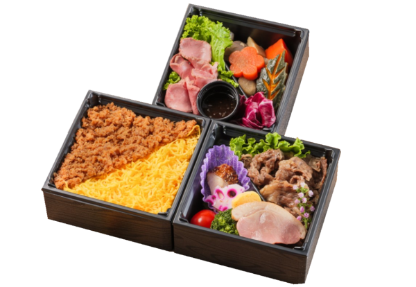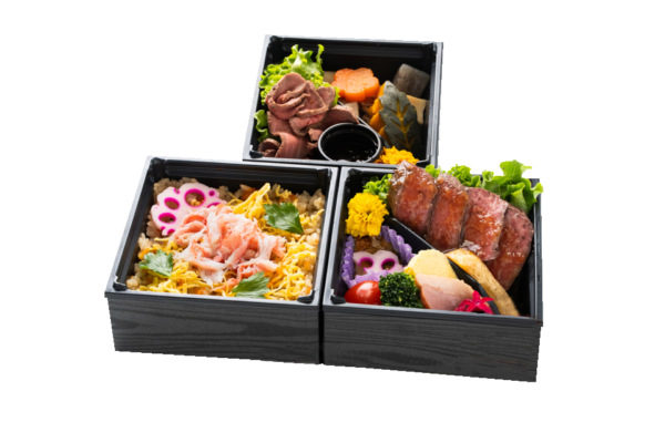 黒毛和牛のすき焼き重、冷めても柔らかい和牛ハンバーグ、肉のうまみが詰まったローストビーフがお楽しみ頂ける三段の御弁当です。
