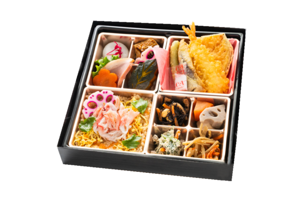 【内容】 紅ズワイ蟹飯・天麩羅4種・カモロース・季節の炊き合わせ・副菜4種・甘味 等