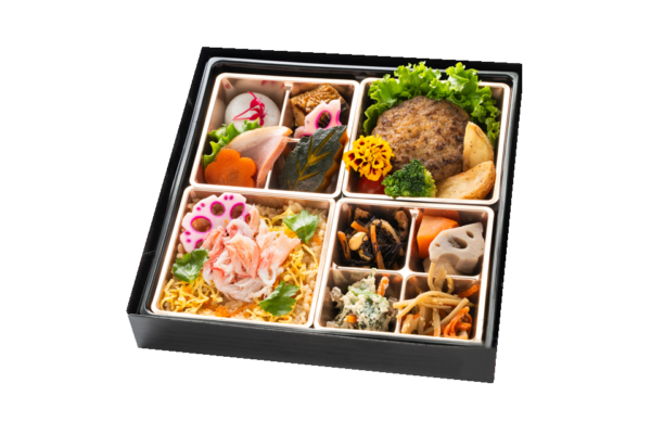 【内容】 紅ズワイ蟹飯・黒毛和牛のハンバーグ・カモロース・季節の炊き合わせ・副菜4種・甘味 等