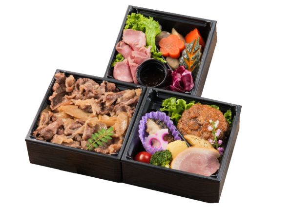 黒毛和牛のすき焼き重、冷めても柔らかい和牛ハンバーグ、肉のうまみが詰まったローストビーフがお楽しみ頂ける三段の御弁当です。