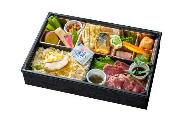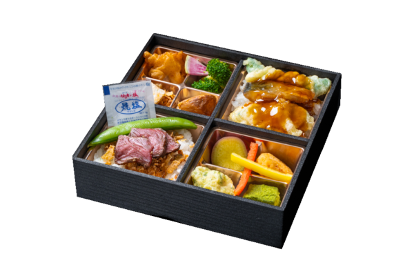 【内容】 厳選牛ステーキ重・三種の天ぷら重・季節のお惣菜・甘味 等