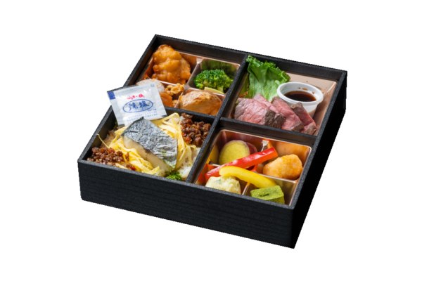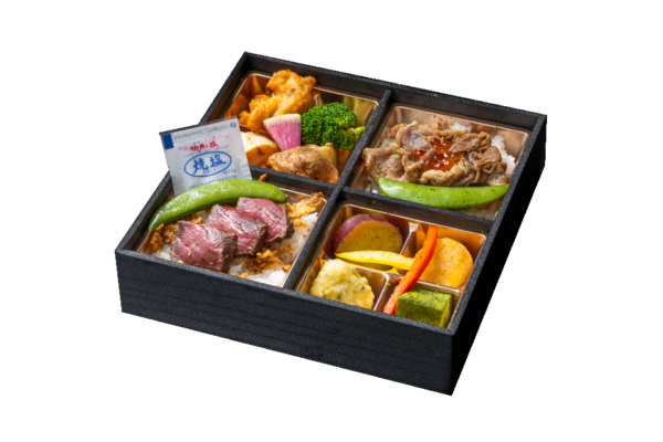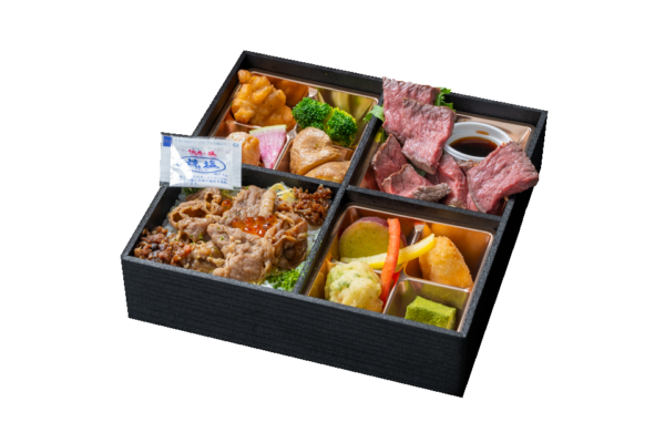 【内容】 厳選牛ステーキ重・牛すき牛タンそぼろ重・季節のお惣菜・甘味 等