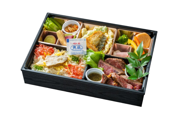 【内容】 熟成厳選牛ステーキ・鮭肉団子甘酢炒め・牛めし・季節のお惣菜 等