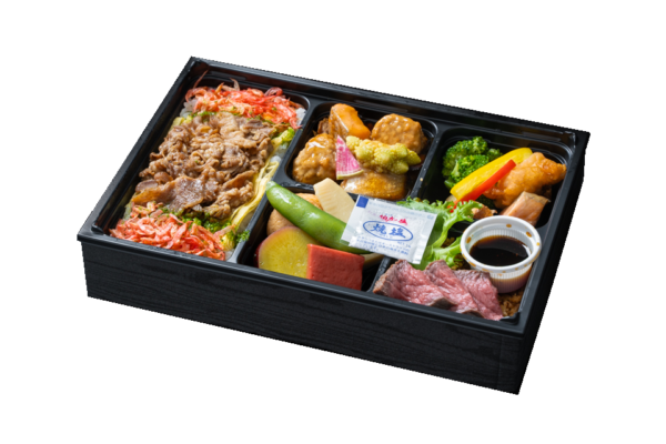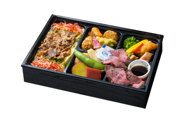 【内容】 厳選牛ステーキ(特盛)・牛すき牛タンそぼろ重・季節のお惣菜 等