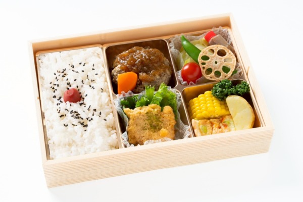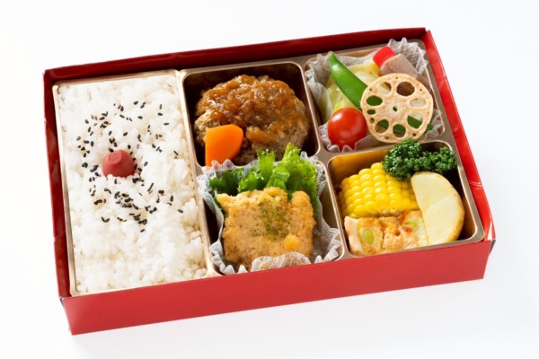 【内容】 黒毛和牛ハンバーグ・白ご飯・ひとくちカツ・サラダ・蒸し野菜・キッシュ 等