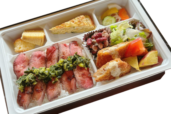 【内容】 ローストビーフ重・白身フライ、アンチョビクリームソース・季節のフリッタータ・自家製ピクルス・シーザーサラダ・小菓子の盛り合わせ 等