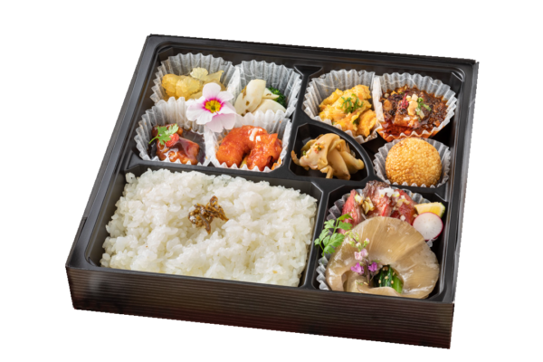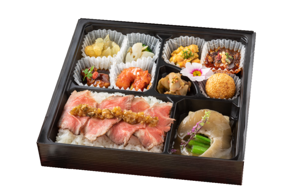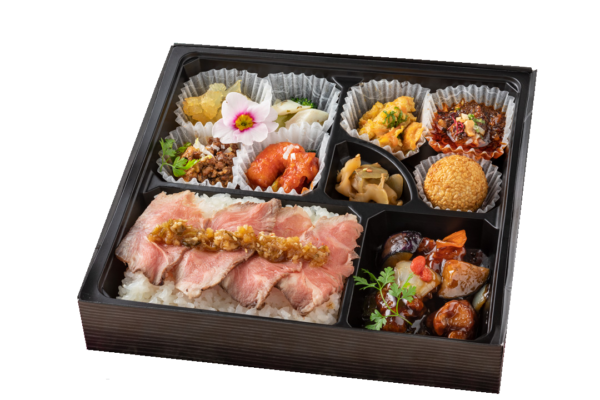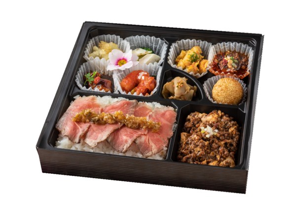 絶対に外さない熊猫弁当に、和牛のローストビーフ、焦がし葱の中国ポン酢をのせて。箱を開けた瞬間のビジュアルで勝負を決めます。(夏季は販売不可)