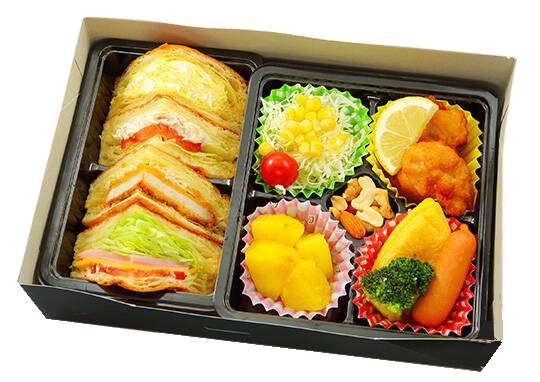 • 一番人気の商品。バターの風味豊かなほんのり甘いデニッシュパンのサンドイッチ。フルーツと生野菜鶏肉入りが人気の決め手となっているサンドイッチ弁当です。