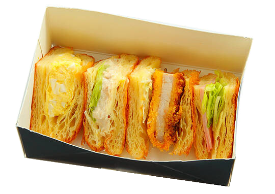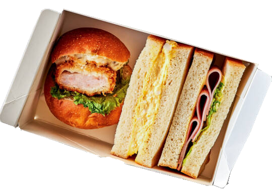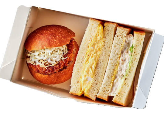 • メディアで何度も紹介されている、行列ができるパン屋さんとコラボした商品。フワッフワでとろける口どけのブリオッシュで、プリプリの肉厚エビカツをサンドしたブリオッシュサンド。食パンサンドは毎朝焼きたてのふわふわ食パンで作っています。