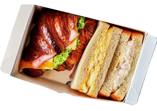 • メディアで何度も紹介されている、行列ができるパン屋さんとコラボした商品。店舗で一番人気の焼きたてクロワッサンで、フレッシュなハムとチェダーチーズをサンドしたボリュームたっぷりのクロワッサンサンド。食パンサンドは毎朝焼きたてのふわふわ食パンで作っています。
