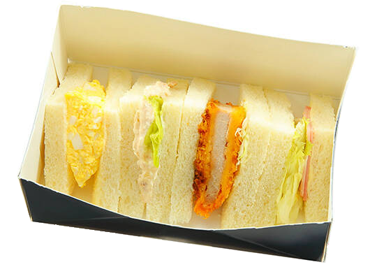 【内容】 タマゴサンド・トンカツサンド・ハムサンド・ツナサンド ※仕入れ状況により、副菜の内容が変わる場合がございます。
