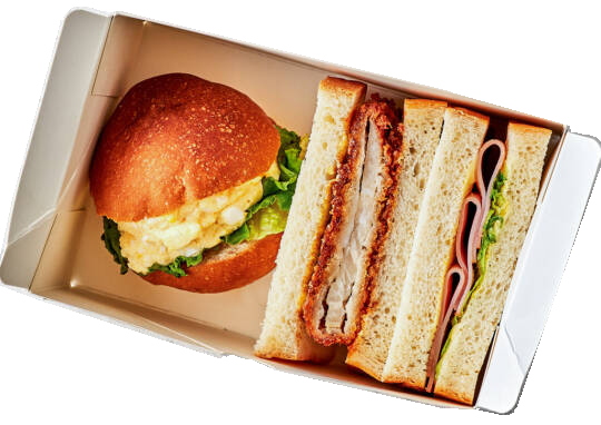 • メディアで何度も紹介されている、行列ができるパン屋さんとコラボした商品。フワッフワでとろける口どけのブリオッシュで、フレッシュな玉子サラダをサンドしたブリオッシュサンド。食パンサンドは毎朝焼きたてのふわふわ食パンで作っています。