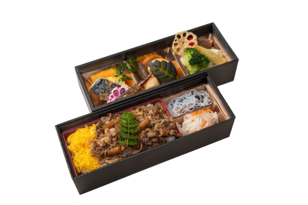 黒毛和牛すき焼き、ローストビーフ等のお肉と伝統的な和食素材を松花堂風弁当に仕立てました。