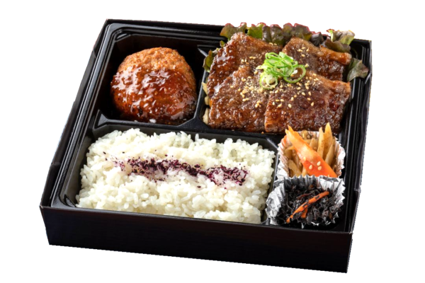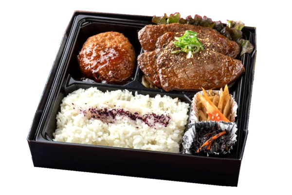 【内容】 極上ロース・黒毛和牛ハンバーグ・白米・季節のお惣菜 等