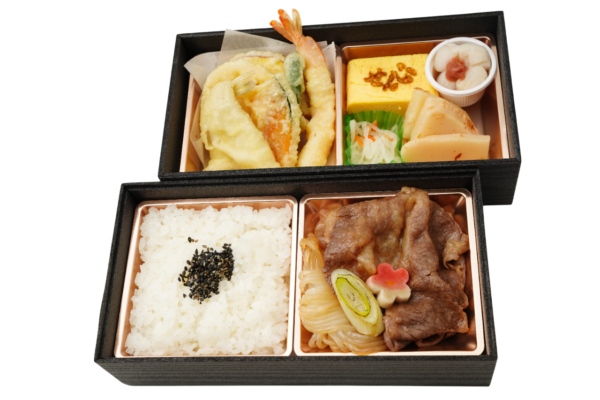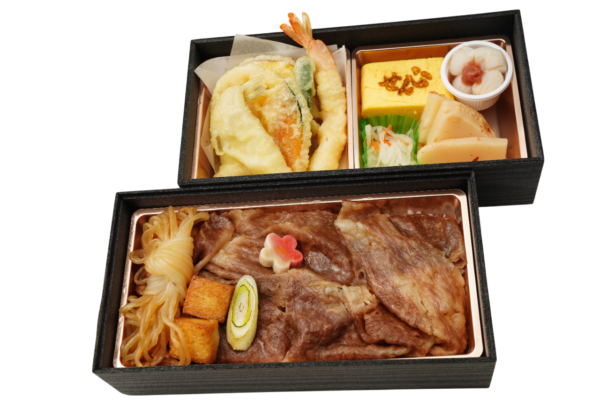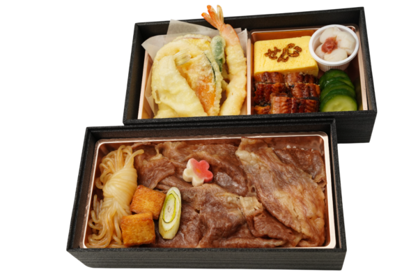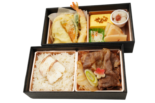 ふっくら炊き立ての白ご飯と、とろける黒毛和牛焼肉。上段には、天ぷら・だし巻き玉子・小貝柱など、彩り豊かな和惣菜を丁寧に詰め合わせました。おもてなしにも最適な、定番にして上質な二段弁当です。