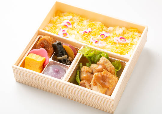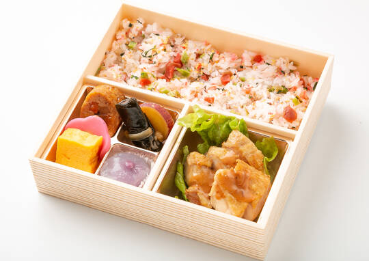 丁寧に焼き上げた鶏もも肉に製のソースをかけた逸品。彩り豊かな季節の副菜と共にお召し上がりください。梅ちりめんをちりばめた彩りご飯との相性も抜群のおすすめ弁当です。