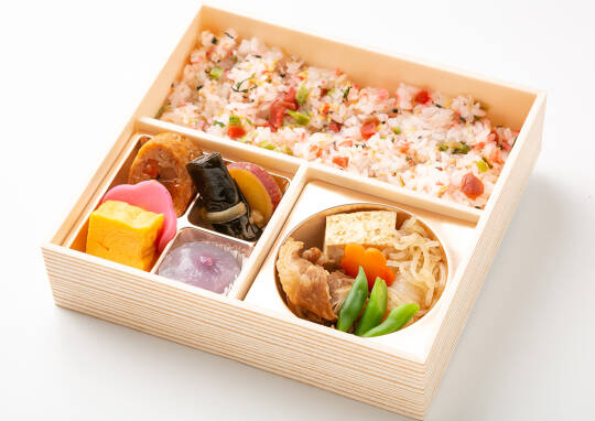 【内容】 牛すき焼き・鶏の八幡巻・花かまぼこ・卵焼き・昆布巻き・サツマイモ甘露煮・錦糸ご飯[約160g]・甘味 ※仕入れ状況により、副菜の内容が変わる場合がございます。