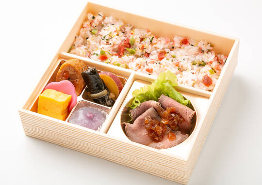 【内容】 ローストビーフ・鶏の八幡巻・花かまぼこ・卵焼き・昆布巻き・サツマイモ甘露煮・梅ちりめんご飯[約160g]・甘味 ※仕入れ状況により、副菜の内容が変わる場合がございます。