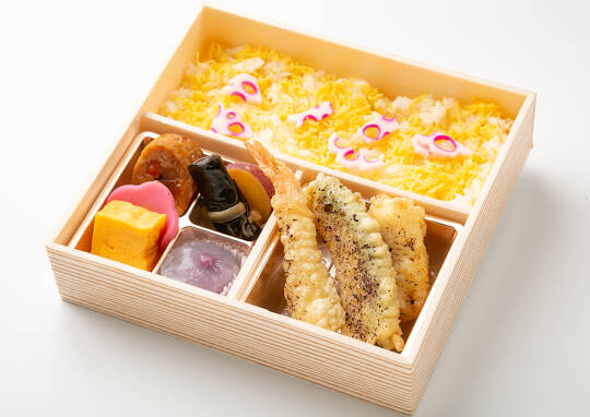 海老天、イカ、カボチャの三種類の天ぷらを詰め込んだぜ贅沢な逸品。彩り豊かな錦糸ご飯と、色とりどりの季節の副菜と共にお召し上がりください。