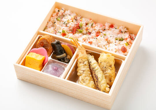 海老天、イカ、カボチャの三種類の天ぷらを詰め込んだこだわりの逸品。彩り豊かな梅ちりめんをあしらったご飯との相性も抜群です。