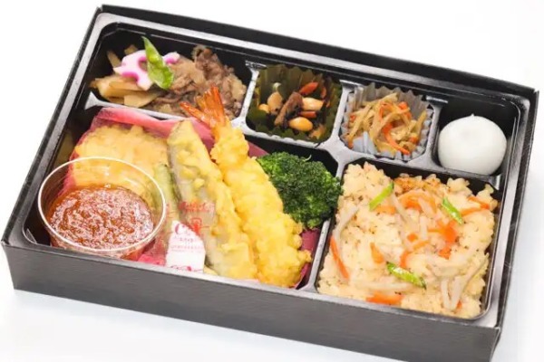 【内容】 鶏五目ご飯・4種の天婦羅(海老、季節の野菜など)・季節の副菜・甘味