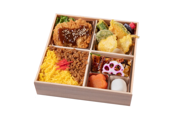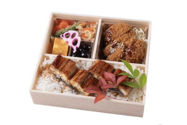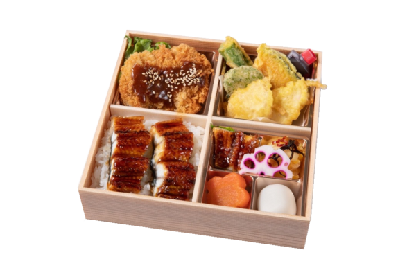 【内容】 鰻重・味噌カツ・季節の天ぷら・人参の煮物・酢蓮根・甘味 等