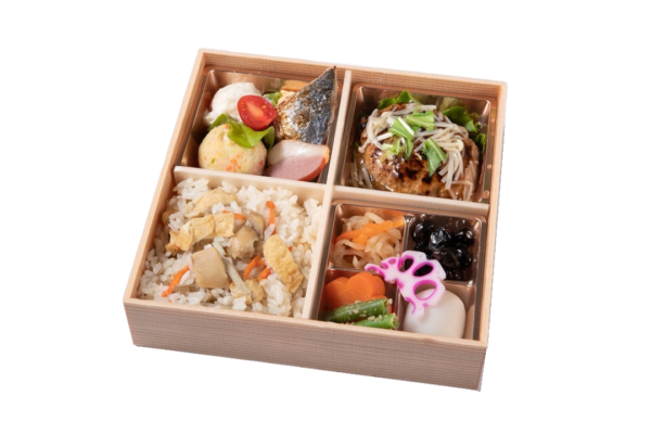 自家製ハンバーグに自慢の和風餡をかけ、出汁にこだわり抜いた自慢の炊き込みご飯とこだわりの炊き合わせを詰め込んだお弁当です。至高の和風ハンバーグを是非ご賞味ください。
