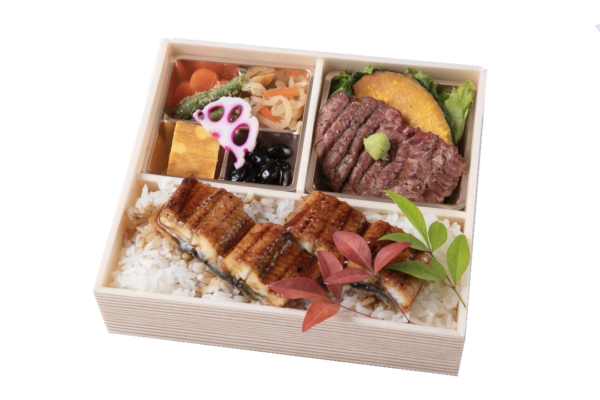 【内容】 鰻重・特選黒牛ステーキ・人参の煮物・いんげんの胡麻和え・黒豆・切干大根・酢蓮根 等