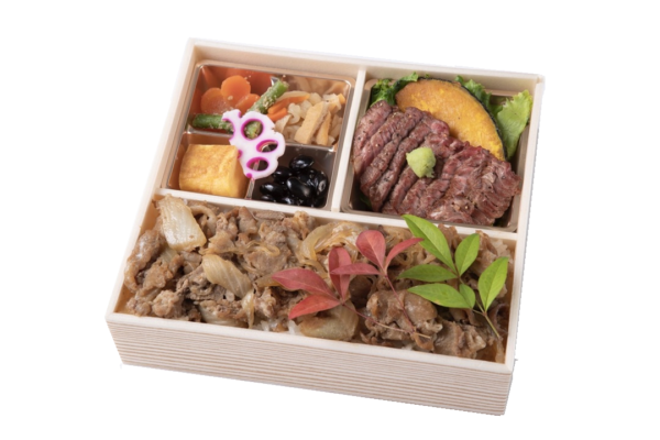 【内容】 すきやき重・特選黒牛ステーキ・人参の煮物・いんげんの胡麻和え・黒豆・切干大根・酢蓮根 等