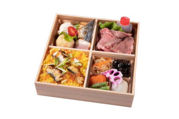 【内容】 炊き込みご飯・うなぎの蒲焼・すきやき・人参の煮物・いんげんの胡麻和え・黒豆・切干大根・酢蓮根・甘味 等
