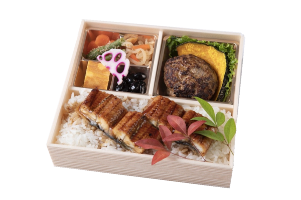 【内容】 鰻重・自家製和風ハンバーグ・人参の煮物・いんげんの胡麻和え・黒豆・切干大根・酢蓮根 等